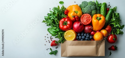 Fresh Fruits and Vegetables in a Paper Bag on a White Background, Representing Healthy Eating and Food Delivery Services with Ample Space for Text.