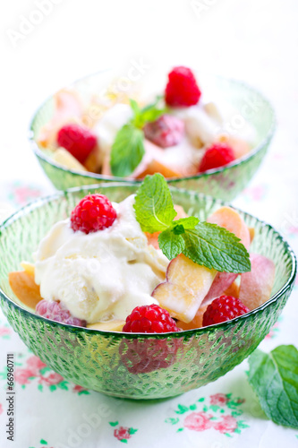 apricot, berry, bowl, cold, cream, dessert, diary, food, fresh, fruit, healthy, homemade, ice, ice cream, milk, peach, raspberry, snack, sweet, treat
