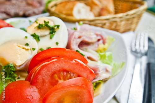 Fresh fruits salad and ham with egg