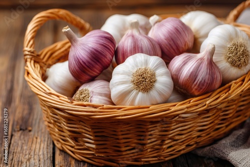 Fresh garlic bulbs resting in a wicker basket on rustic wooden table