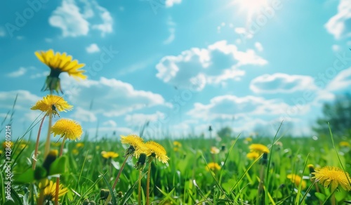 Fresh grass spring meadow with dandelions with blurred background and blue sky bright natural.