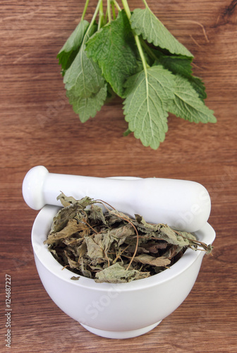 Fresh green and dried lemon balm in mortar, herbalism, alternative medicine