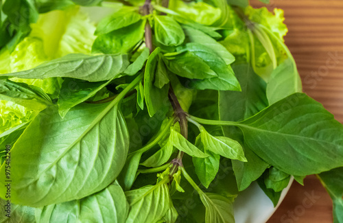 Fresh green Basil leaves. Basil leaves closeup, green background basil leaf texture, growing basil in the garden