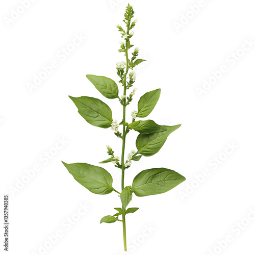 Fresh Green Basil Plant with Tiny White Flowers Isolated on Transparent Background
