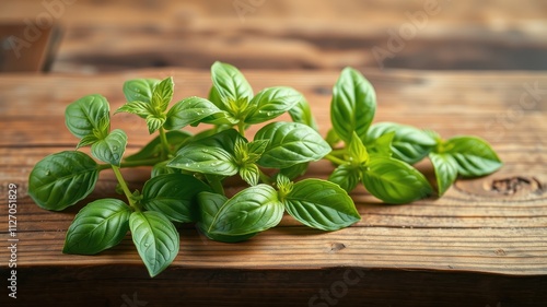 Fresh Green Basil Sprigs on Rustic Wooden Surface