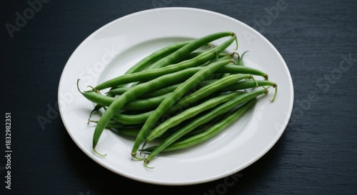 Fresh green beans on a white plate, dark background