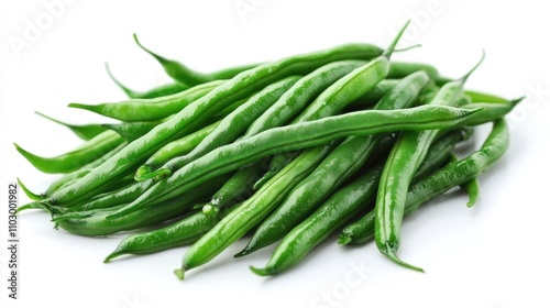 Fresh green beans stacked elegantly on a white background showcasing their vibrant color and culinary versatility for healthy cooking.