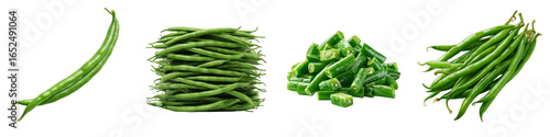 Fresh green beans stacked sliced whole and bundle on transparent background