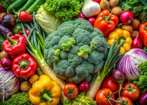 Fresh green broccoli florets overflow from a mound, surrounded by other vibrant vegetables, creating a healthy and colorful background from a top-down perspective.