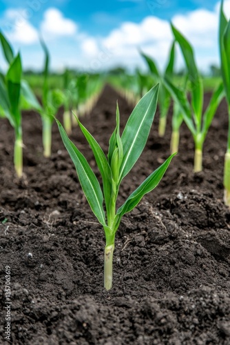 corn, plant, dirtied, green, sky, agriculture, growth, nature, farming, crop, field, environment, rural, landscape, germ bud, earth, botanical, fresh, sunny, vibrant, healthy, spring, cultivation, organic, farm, leaf, sunlight, natural, ecology, harvest, summer, vegetation, germinating, fertile, blue, horizon, lush