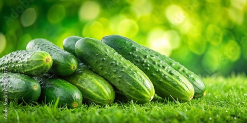 Fresh Green Cucumbers on Lush Grass - Summer Harvest Stock Photo