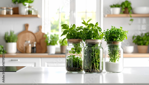 Fresh green herb plant in glass jars on bright kitchen countertop. Healthy organic food for natural cooking, creating serene and vibrant feeling in modern home