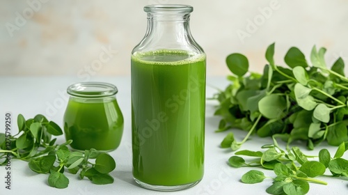 Fresh green juice in glass bottles with vibrant leaves in the background, showcasing healthy lifestyle
