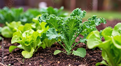 Fresh Green Kale and Lettuce Growing in Garden Bed; Organic Leafy Greens, Healthy Harvest