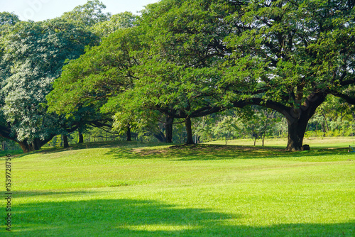 Fresh green lawns in the park. Blur nature bokeh green park trees in morning.