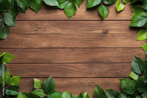 Fresh Green Leaves Frame on Rustic Wooden Background