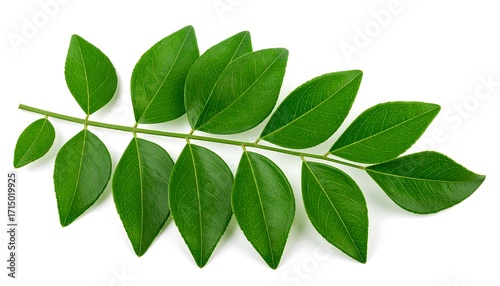 leaf, stem, tree branch, green, fresh, plant, nature, foliage, vibrant, natural, isolated, close, macro, detail, photo, bright, lush, healthy, organic, botanical, texture, pattern, oval, pointed, arrangement, symmetry, smooth, sharp, contrast, white, background, top, view, horizontal, image, leafy, spring, summer, life, growth
