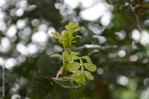Fresh green leaves with water droplets in natural outdoor setting