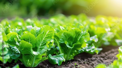 Fresh green lettuce growing in a sunny garden, showcasing healthy leaves and rich soil, perfect for organic farming themes.