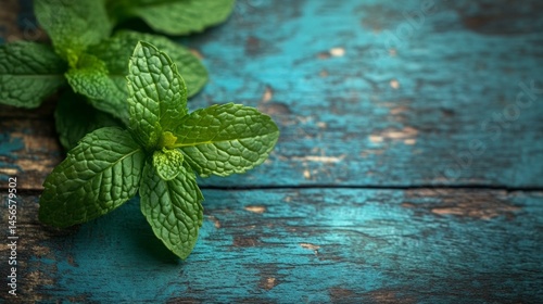 Fresh green mint leaves on a weathered blue table showcase detailed veins and curls, creating a refreshing and rustic image.