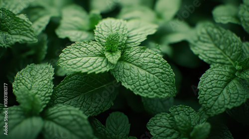 Fresh green mint leaves with textured surfaces create lush, vibrant scene. rich green color and intricate leaf patterns evoke sense of freshness and vitality