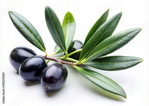 Fresh green olive branch with delicate leaves and a few small ripe black olives rests isolated on a clean white background, symbolizing peace and harmony.