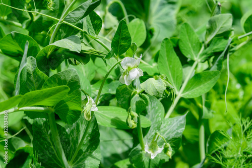 Fresh green organic peas leaves and white flowers in a traditional vegetables garden in a summer day, selective focus