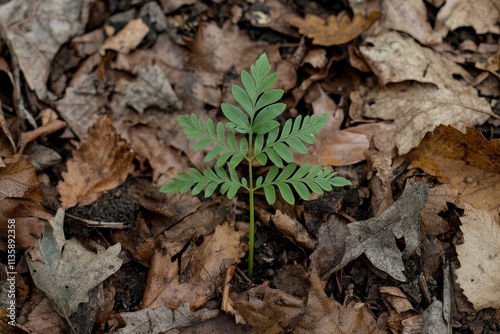 Fresh Green Plant Emerges from Dry Brown Leaves in Forest Floor, Symbolizing Renewal and Resilience in Nature's Cycle of Life and Growth