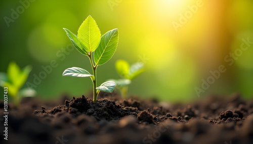 Fresh Green Plant Growing in Fertile Soil Against a Bright Sunshine Background