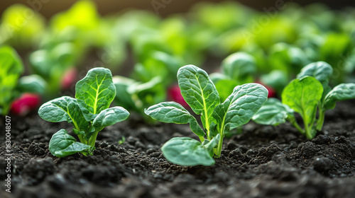 Fresh green spinach plants growing in rich dark soil, showcasing vibrant leaves and healthy growth in a lush garden environment, symbolizing agricultural abundance and sustainability