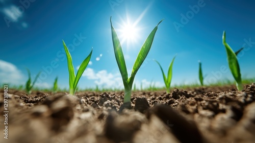 Fresh green sprouts emerge from the rich brown soil, symbolizing growth, nature, and the start of new life in a bright, sunny environment.