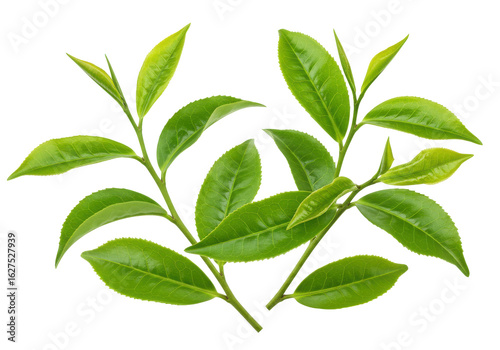 Fresh green tea leaves arranged artistically on a transparent background