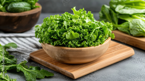 Fresh greens wooden bowl cutting board, surrounded by leafy vegetables, create vibrant