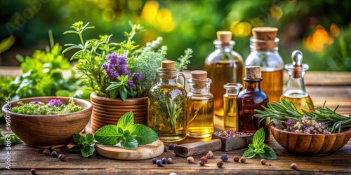 Fresh herbs and assorted oils for aromatherapy and massage displayed on a rustic wooden table