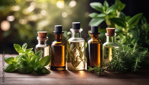 fresh herbs and essential oils in elegant bottles surrounded by greenery