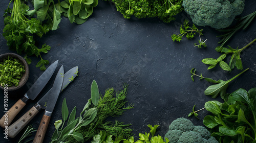herb, vegetable, fresh, cooking, culinary, ingredient, food, kitchen, organic, produce, healthy, diet, nourishment, epicure, raw, preparation, chopping, knife, rustic, background, overhead, dark, table, countertop, greener, leafy, aromatic, seasoning, favor, natural, wholesome, savoury, vitamin, mineral, gastronomy, eatery, vegetarian, vegan, eating, lifestyle, wellness, delicious