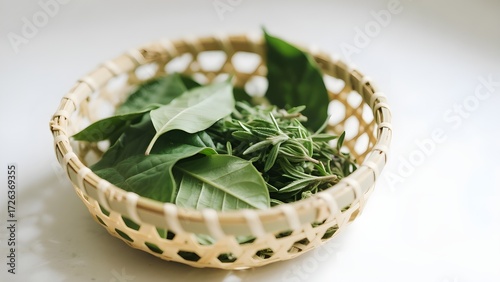 herb, bay, rosemary, basket, woven, fresh, green, leaf, natural, light, beige, food, kitchen, cooking, ingredient, healthy, organic, display, still life, closeup, detail, nature, culinary, aroma, freshness, natural light, texture, bamboo, organic food, ingredient, cookery, health food, kitchen utensile, home decor, rustic, simple, elegant, food photography