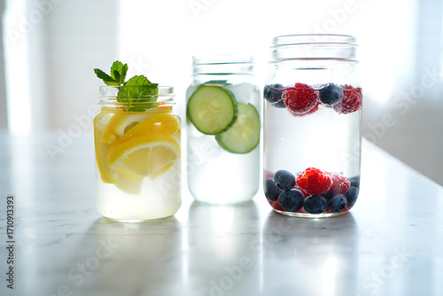 refreshment, raspberry, blueberry, lemon, cucumber, mint, water, ice, healthy lifestyle, wellness, hydratation, fresh, clean, natural, organic, diet, nourishment, antioxidant, vitamin, spa, bright, studio shot, food photography, vibrant, minimal, countertop