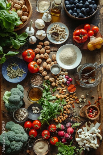 raw, food, preparation, ingredient, table, workshop, fresh, healthy, nut, seed, vegetable, kitchen, tomatoes, cooking, organic, diet, nourishment, broccoli, basil, garlic, chopping board, cashew, almond, overhead, culinary, receipe, meal, herb, lifestyle, epicure, vegan, vegetarian, health, dining, cookery, natural, eating, fresh produce, culinary arts