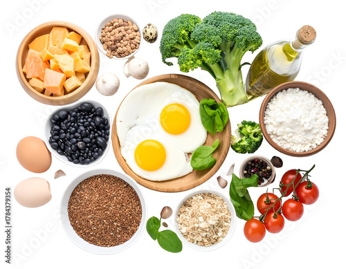 Fresh ingredients for a healthy breakfast including eggs, vegetables, cheese, and grains arranged on a surface