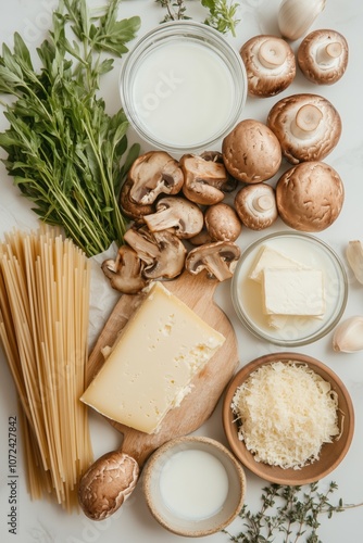 Fresh ingredients for creamy mushroom pasta: cheese, herbs, and garlic