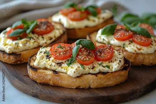 Fresh Italian Bruschetta Toast with Creamy Cheese and Basil on Wooden Board