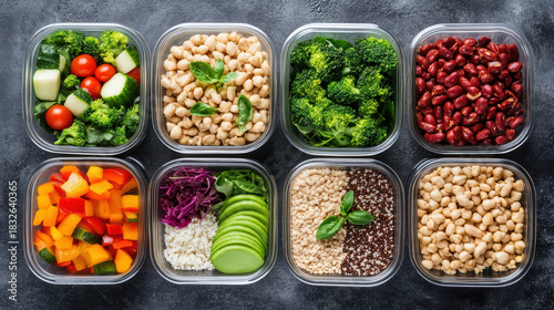 Fresh meal prep containers with vegetables grain and legumes arranged neatly, vibrant healthy