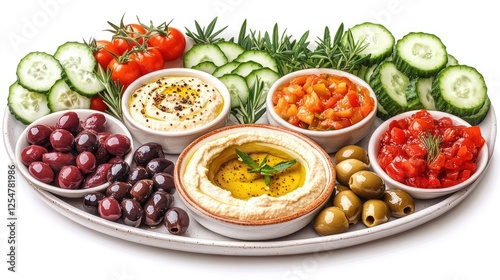 Fresh Mediterranean Platter with Hummus, Olives, and Colorful Vegetables on a White Background