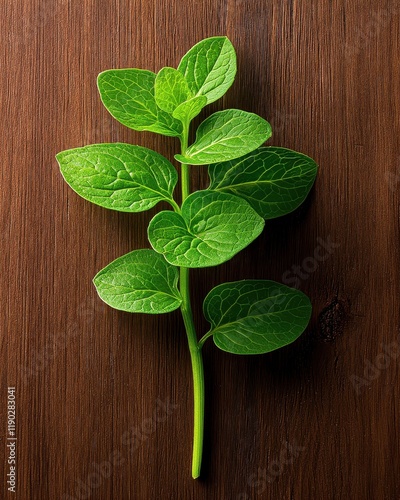 [Fresh Mint Leaf on Wood Surface] Fresh Mint Leaf on Wooden Surface, Close-up Shot for Culinary & Herbal Use