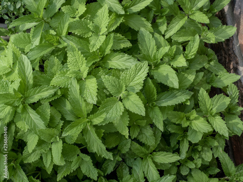 Fresh mint leaves in the garden. Close up. Overhead shot.
