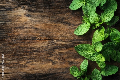 mint, herb, green, leaf, wood, rustic, kitchen, cooking, fresh, garnish, favor, organic, botanical, natural, culinary, decoration, nourishment, aromatic, food, agriculture, texture, seasoning, plant, foliage, healthy, ingredient, produce, preparation, nature, vegetarian, wellness, vibrant, bright, garden, receipe, essential, oil, tea, scent, aroma, spice, generative, ai