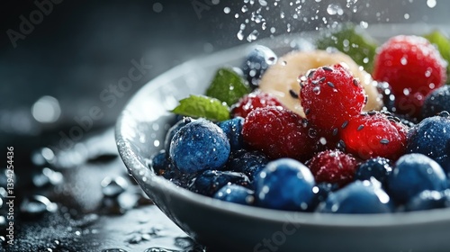 Fresh mixed berries and banana salad. Water splashes over the healthy mix