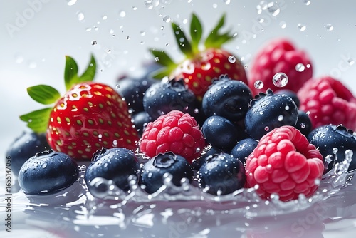 berry, mixed, strawberry, blueberry, raspberry, fruit, fresh, healthy, food, refreshing, water, splashing, droplet, closeup, macro, vibrant, red, blue, pink, nature, diet, nourishment, organic, sweet, juicy, summer, photo, antioxidant