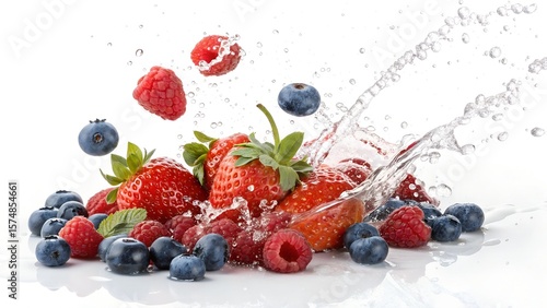 berry, fresh, mix, strawberry, blueberry, raspberry, water spray, splashing, healthy, fruit, juicy, ripe, vibrant, colourful, summer, refreshing, wet, dripped, droplet, falling, motion, diet, healthy eating, antioxidant, vitamin, sweet, natural, organic, delicious, ingredient, dessert, breakfast, smoothie, white background, studio shot, high speed, dynamic, red, blue, green, strawberry, food, raspberry, blueberry, blackberry, fruit, white